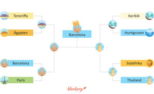 Im nächsten Schritt nimmst du die oben erstellte Liste und fügst sie nun in dieses K.O.-Turnier Format ein. Dabei kannst du auch gerne schauen, ob du die Reiseziele thematisch zusammenfassen kannst. Wenn du z.B. eine Städtereise Paris und Barcelona drin hast, lass die beiden direkt gegeneinander antreten. So könnt ihr erstmal entscheiden, welche eure liebste Städtereise wäre und dann überlegen, ob ein Pauschalangebot nicht passender wäre.